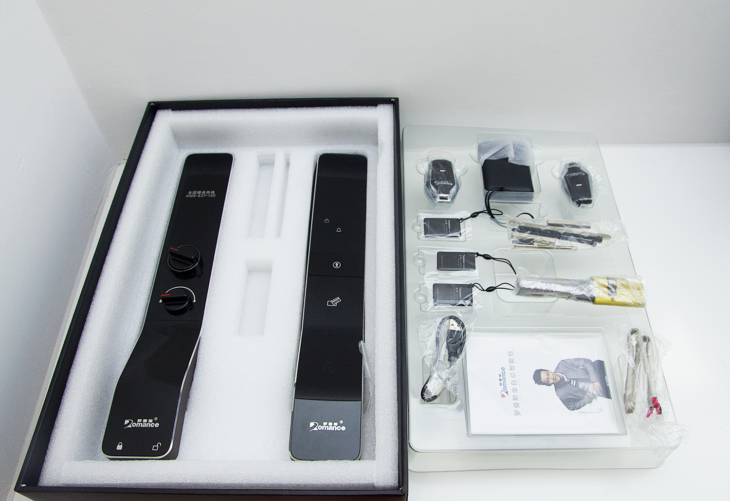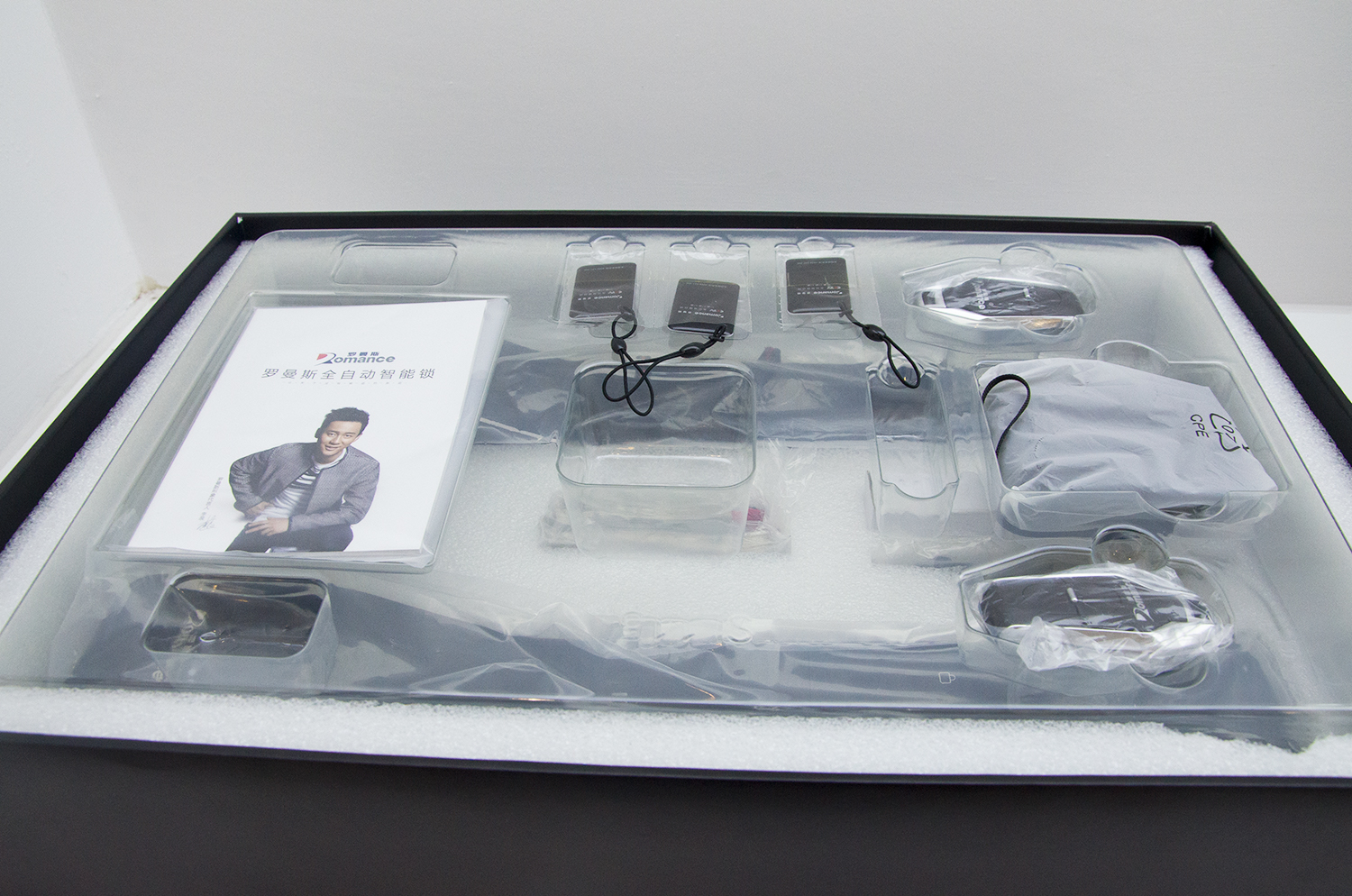 下面我們來看一下DD5的全體成員:前后鎖板各一個、鎖芯、前后鎖板連接線1條、2把鑰匙、2個遙控器、3張IC卡、充電寶1個、充電線1個、三包服務1份、螺絲配件包1份等。零件基本做工細致,大概是經過表面處理,用手摸上去,觸感光滑,很有質感。