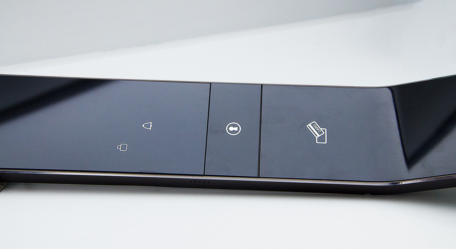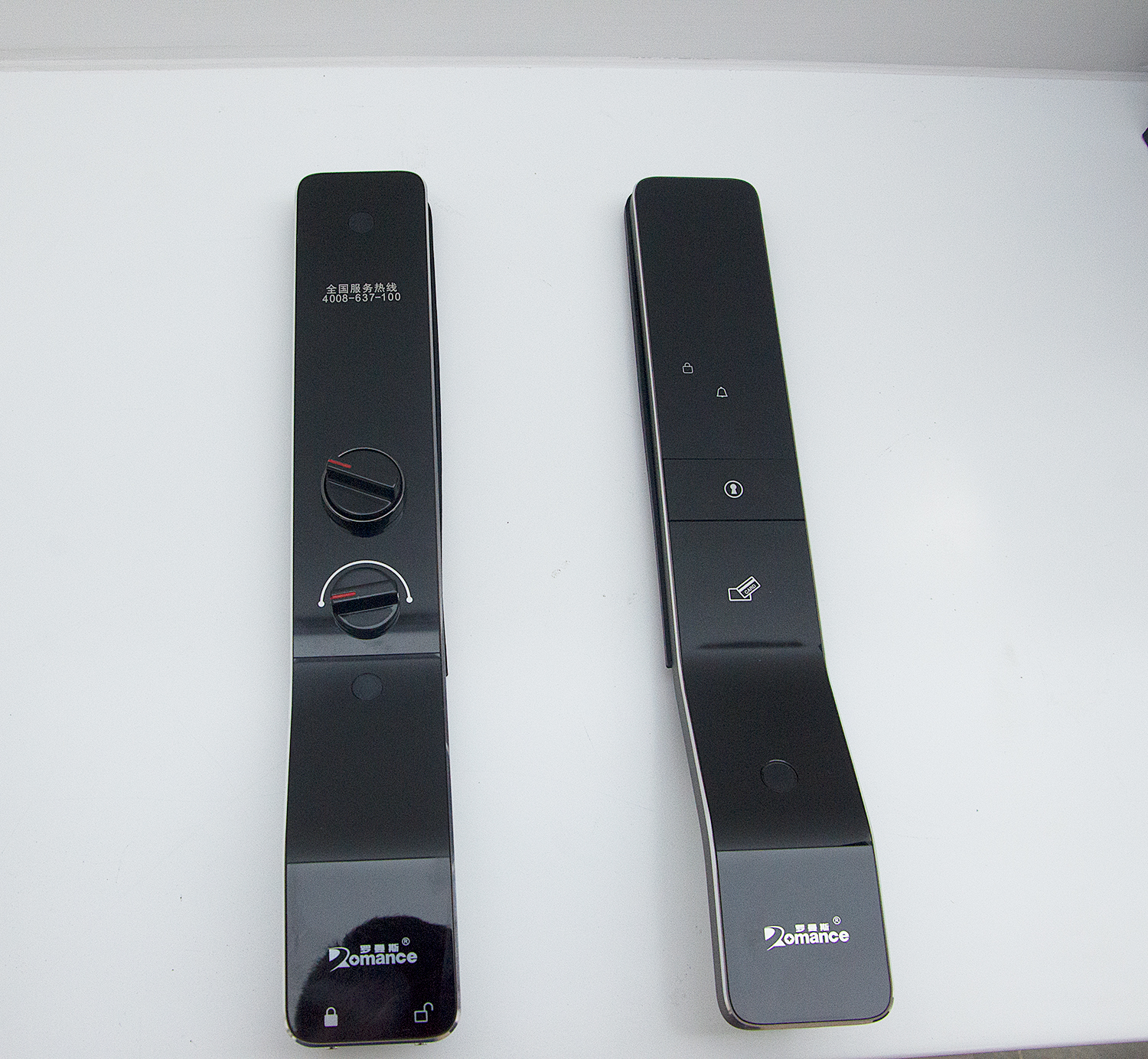 ? ? ? ?前鎖板(右)上分別有密碼識別區、門鈴按鍵、IC卡感應區、指紋感應區、logo。